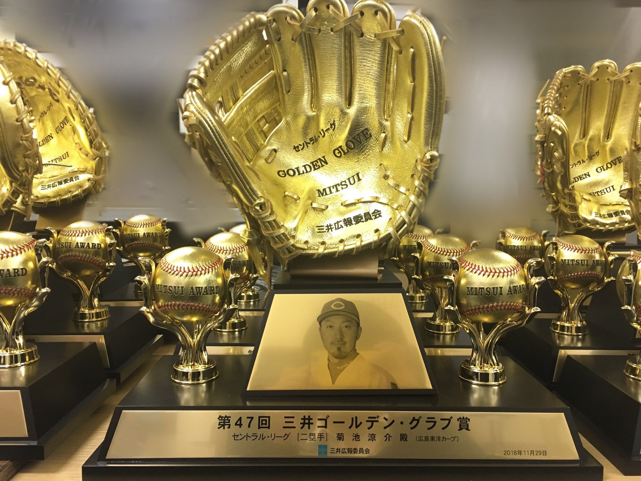 Twitter 上的 三井ゴールデン グラブ賞 いよいよ明日は 第47回三井ゴールデン グラブ賞の表彰式です 本年度の受賞 選手に贈呈するトロフィーが完成しました キャンペーンに応募して このトロフィーと同じ金の革で作った 受賞選手直筆サイン入りボール をゲット